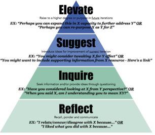 When I reflect on my personal teaching, I now understand the need to overtly use and teach a process for students to provide feedback.  Just by having students partner-up and work together or critique another’s work, does not mean they know how to provide effective feedback.  They need to be overtly taught how to provide it.  I have found the RISE method to be a great tool to help teachers and students to see the levels in feedback.